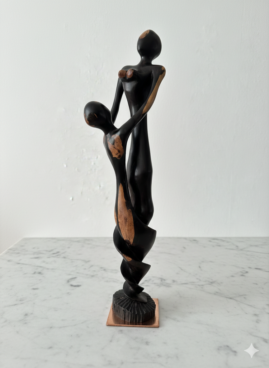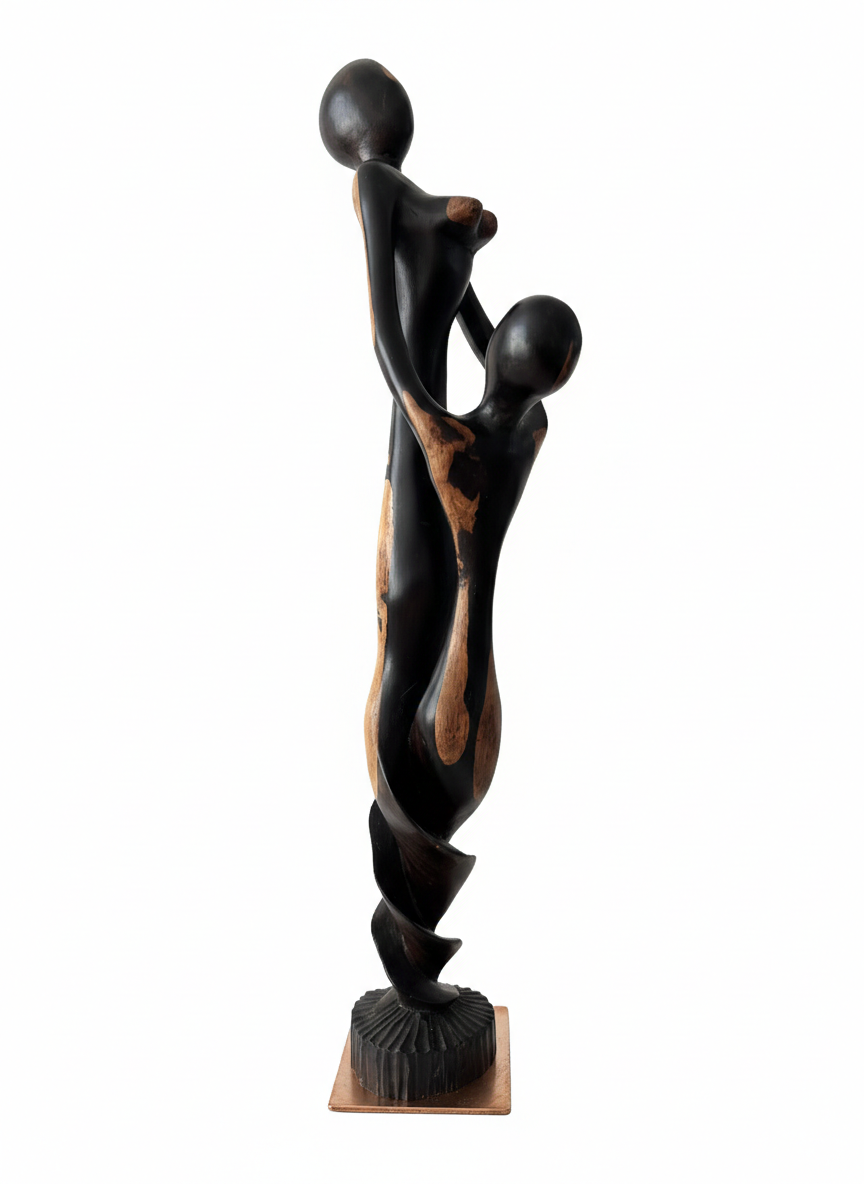 The sculpture depicts the fluid, elongated forms of a mother and child in a graceful embrace. Carved from a single block of indigenous Tanzanian hardwood, it features a dramatic two-tone finish: a deep, hand-polished ebony-style exterior that spirals to reveal the warm, raw grain of the wood within. This “ribbon” effect symbolizes the interconnectedness of life and family.